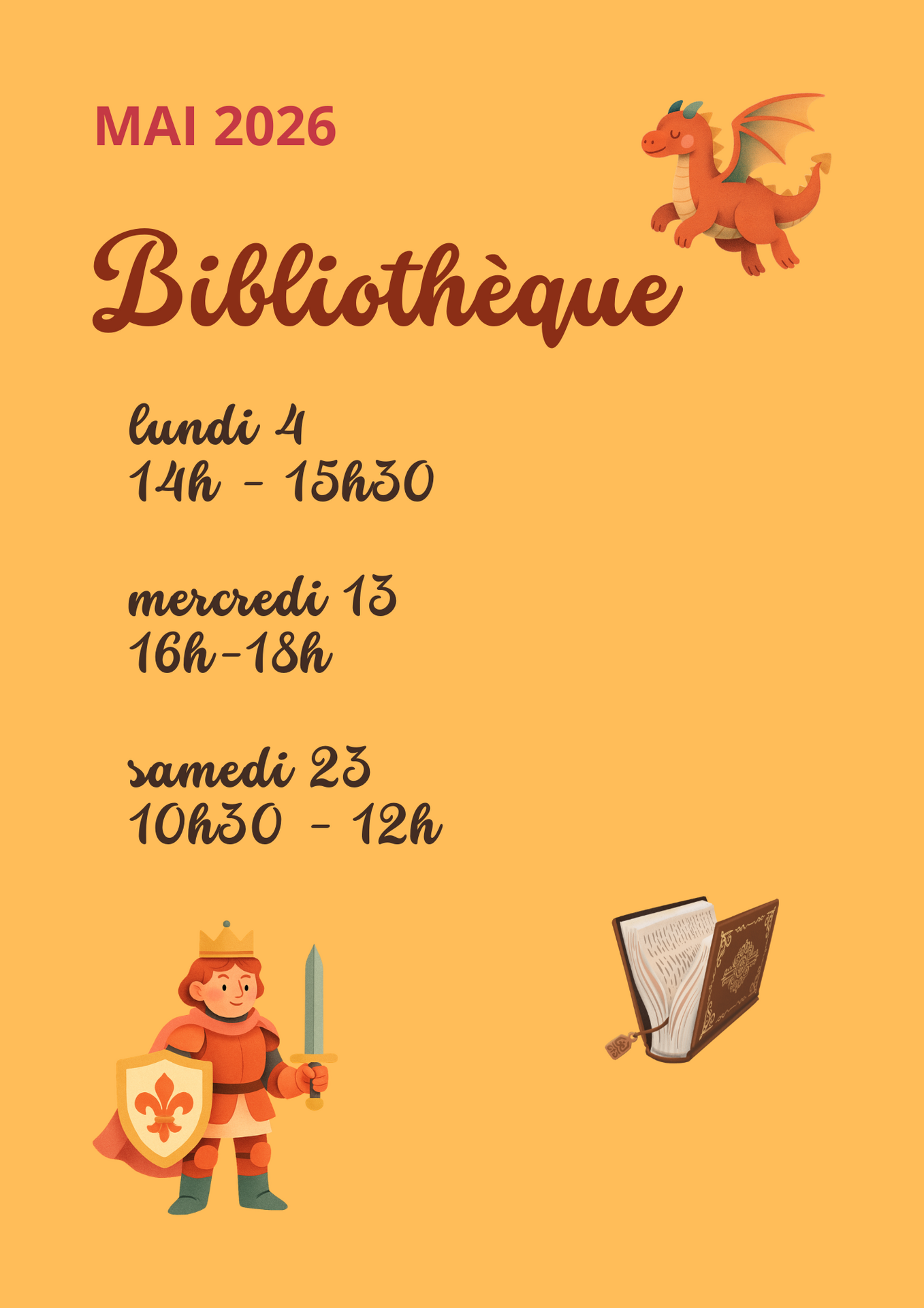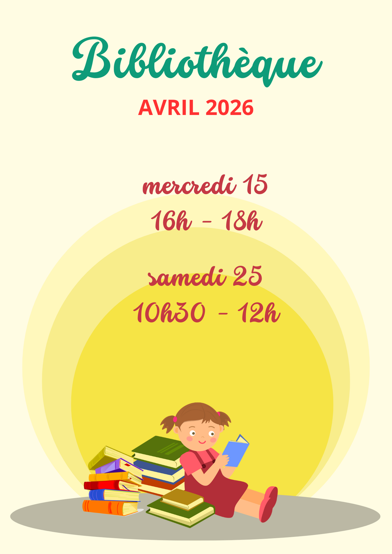 Pour le premier semestre 2026, la bibliothèque sera ouverte le lundi de 14h00 à 15h30, le mercredi de 16h00 à 18h00, le samedi de 10h30 à 12h00 pour les dates suivantes : :